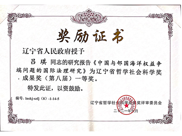 近日,辽宁省人民政府发布第七届、第八届辽宁省哲学社会科学奖·成果奖(省政府奖)奖励决定,经资格审查、初评、复评、终评、拟获奖公示,我院吕琪老师参与研究的《中国与邻国海洋权益争端问题的国际法理研究》荣获一等奖。该研究系统探讨了中国与周边海洋邻国之间围绕岛礁归属、海洋划界、资源开发、海上执法、争端解决等问题产生的冲突与分歧,基于国际法理提出中国的海洋维权对策,为巩固海洋边疆、发展海洋经济、建设海洋强国夯实基础。