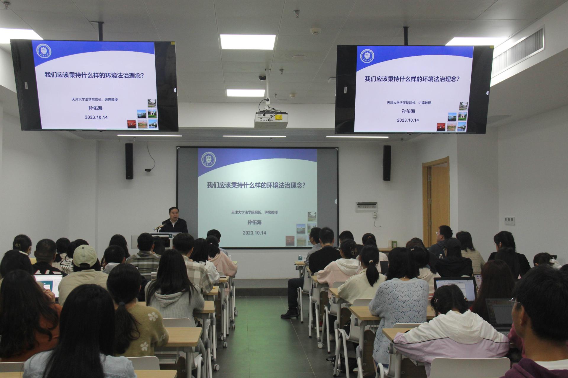 法学院讯(记者 樊星锴 )10月14日晚,广和法学大讲堂在法学院103教室举行。天津大学法学院院长、讲席教授、博士生导师孙佑海作题为《我们应该秉持什么样的环境法治理念?》的学术讲座。法学院副院长文杰教授,院长助理兼法硕中心主任王清军教授,法学院教师周林及本科生、研究生共计80余人参加了讲座。讲座由王清军主持。