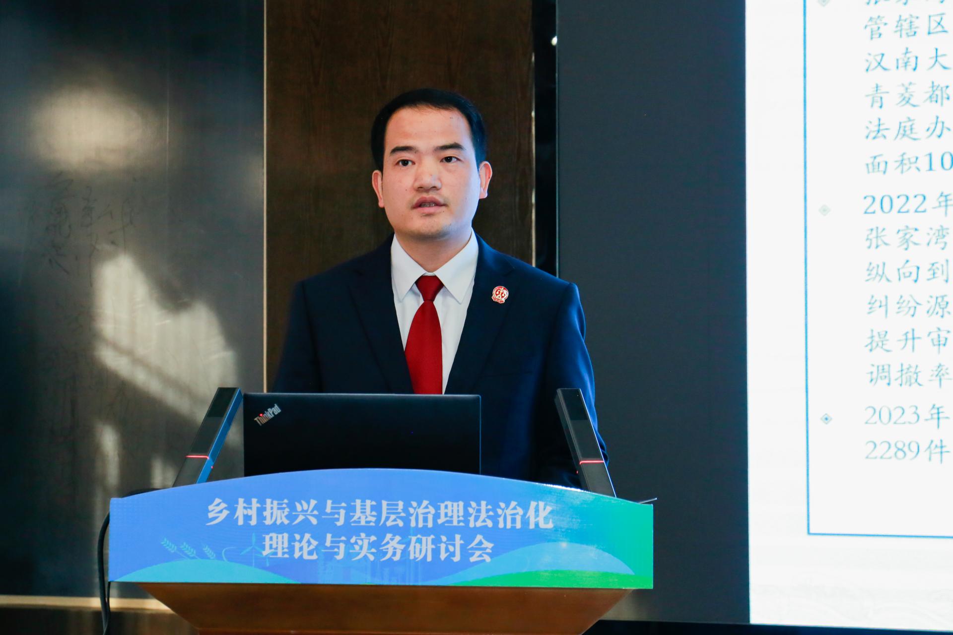 湖北省乡村振兴局老区建设处二级调研员方新龙以《统筹基层力量 推进基层治理》为题进行发言。方新龙指出乡村治理面临的挑战,分析乡村治理队伍建设中存在的一些问题,并提出乡村治理的完善建议。宜昌市兴山县司法局党组书记、局长宋怀宇的发言题目为《用好基层治理“绣花针”绣出“和美兴山”新图景》。宋怀宇总结了兴山县的基层治理特色,聚焦乡村治理问题,指出基层治理应用好党建这枚绣花针,穿起各领域基层治理资源,实现精细化基层治理。黄冈市武穴市石佛寺镇党委副书记张国龙以《构建大调解格局 推动高效能法治》为题目进行发言。张国龙指出,坚持法治思维,构建大调解格局;优化法治空间,发挥调解优势。武汉市律师协会农业农村法律事务专业委员会主任燕非的发言题目为《同心同行同频 共建共治共享》。燕非指出,律师协会是基层治理不可或缺的组成部分,律师协会在基层法治中应做好以下工作:加强政治认同,坚持党建引领;加强专业认同,提升律师专业能力。罗田县司法局党组成员戴小辉的发言题目为《推进司法所规范化建设 筑牢基层社会治理法治根基》。戴小辉介绍了罗田县的司法所规范化建设工作情况,分享了本县关于筑牢基层法治根基的主要做法和经验。罗田县骆驼坳镇燕窝湾村党支部第一书记徐志新围绕《乡村振兴的燕儿谷探索》进行了发言。徐志新介绍了燕窝湾村如何从贫困村发展为全国乡村治理示范村的历史,并结合燕窝湾村治理案例介绍了本村治理经验。