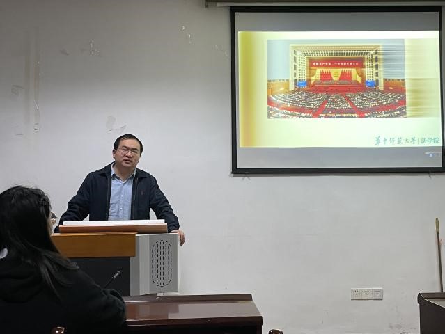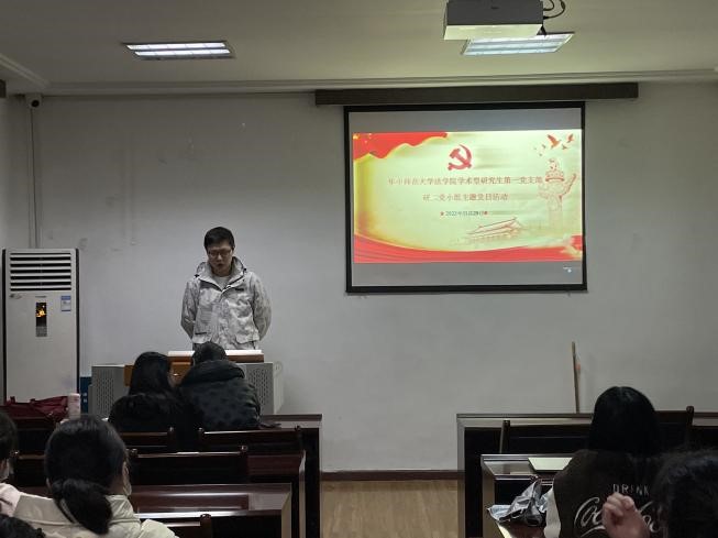 法学院讯(通讯员 万梓行)为深入学习贯彻党的二十大精神,把握习近平法治思想的深刻内涵,11月28日法学院学术型硕士第一党支部开展“学习二十大,奋进新征程”主题党日。法学院副院长肖登辉副教授受邀出席讲授党课,学术型硕士第一党支部副书记郑梦琴主持活动。
