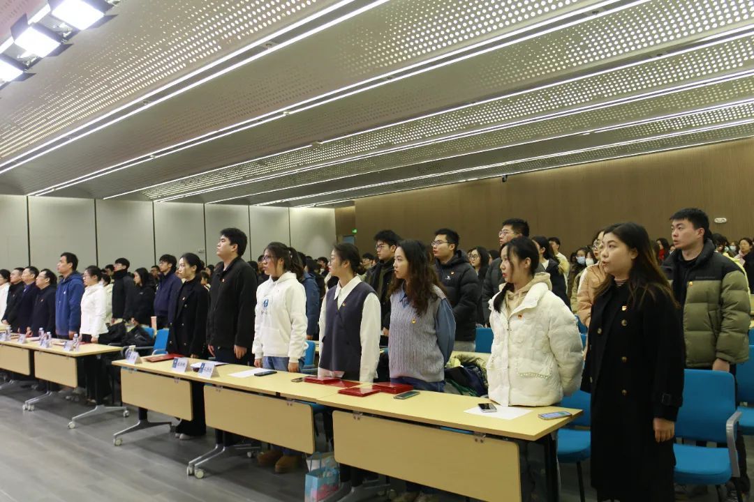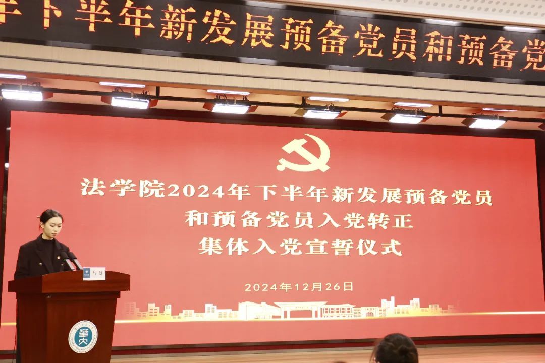 12月26日,我院于文科综合楼一楼报告厅举行2024年下半年新发展预备党员和预备党员入党转正集体入党宣誓仪式。学院党委书记杨臣、党委副书记万枞,教师代表石聚航、周林、姜孝文、王彦舒,党务干事曾谛以及各学生党支部书记,学生党建中心全体成员,全体在校学生党员,入党积极分子代表参加仪式。我院团委书记、学生党建中心副主任张永基主持。