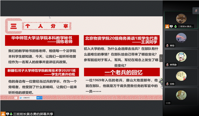 为赓续红色基因、增强国防意识,3月20日晚上19点,法学院本科2003团支部在班长黄志勇的主持下开展了以“学习戍边英雄,争做合格青年”为主题的线上团日活动。法学院党委副书记万枞、本科教学秘书田栋以及2003团支部全体同学参与了本次活动。