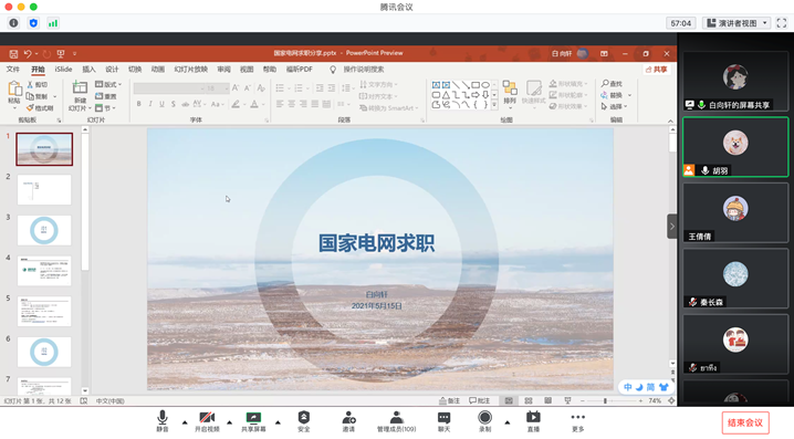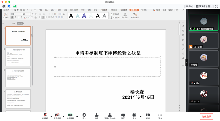 5月15日上午,我院2021届毕业研究生就业经验分享会在腾讯会议举行。研究生辅导员胡羽、毕业研究生代表秦长森、张贝特、白向轩、顿泽宇及2019级研究生参加本次活动。活动由胡羽主持。
