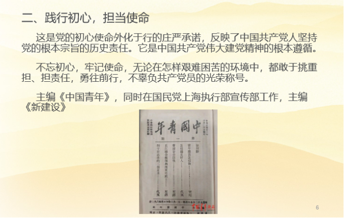 践行初心,担当使命。这是党的初心与使命外化于行的庄严遵循,反映了中国共产党人坚持党的宗旨的历史责任,是党的伟大建党精神的根本遵循。李良明通过三件英雄事迹深刻展现恽代英的使命担当,重现恽代英为共产党孜孜不倦工作,伟大无私奉献的场景。无论在怎样艰难困苦的环境中,他都敢于挑重担、担责任,勇往前行,不辜负共产党员的光荣称号。