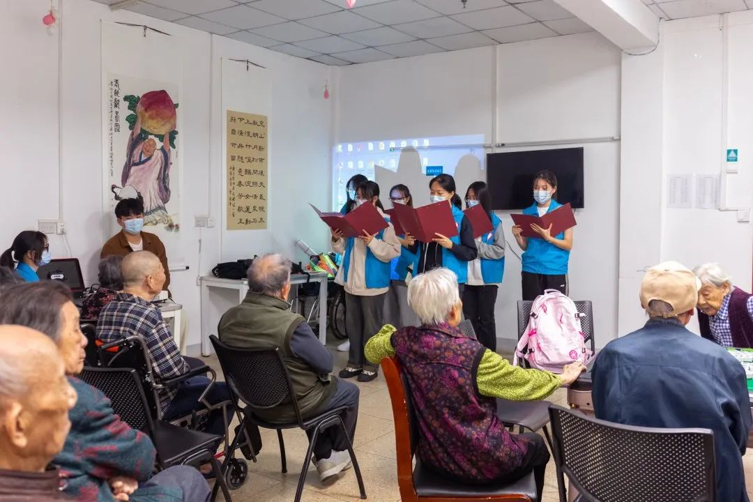 在文艺表演中,志愿者们演唱经典歌曲《外婆的澎湖湾》,把老人们的思绪牵到了美丽的澎湖湾;朗诵诗歌《岁岁重阳,今又重阳》《老有老的骄傲》为老人们送上真切祝福;表演手指操《棒棒糖》,展现青年的朝气和活力。文艺表演的间隙,志愿者们也结合专业所学,为爷爷奶奶宣讲法律知识,志愿者王全峥揭露五大养老诈骗,提醒老人提高防范意识。“五星红旗迎风飘扬,胜利歌声多么响亮,歌唱我们亲爱的祖国……”,最后,志愿者们唱起了《歌唱祖国》,爷爷奶奶也打着节拍,和志愿者们一同歌唱。