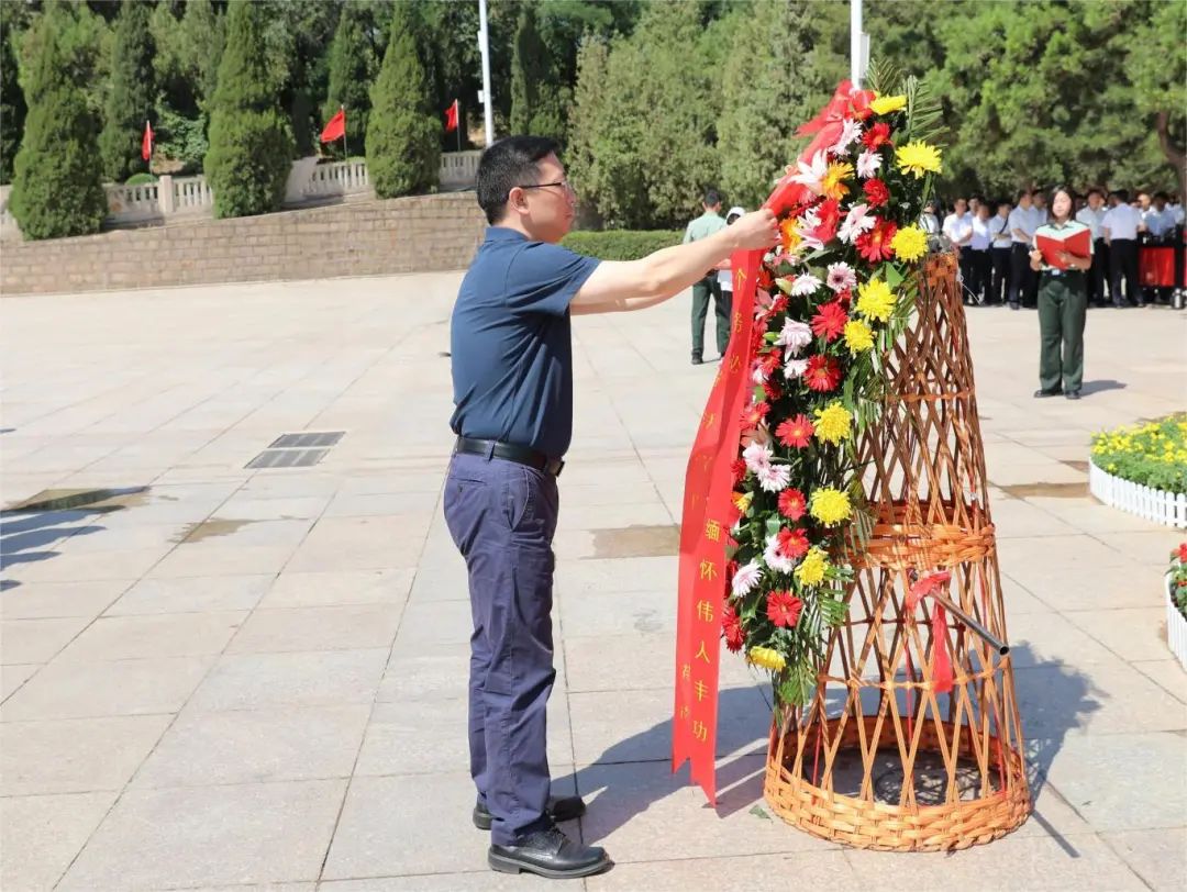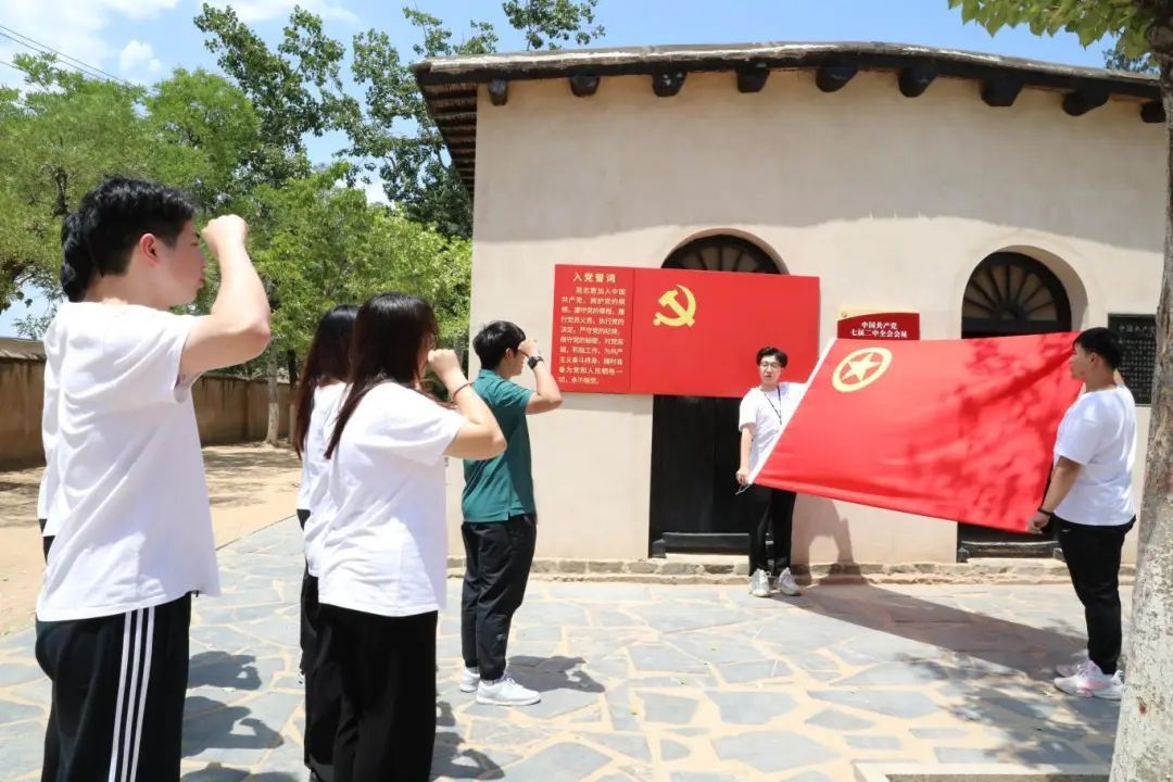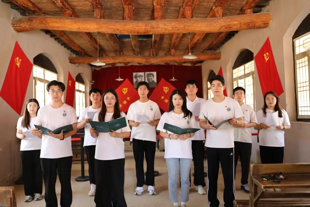 在西柏坡纪念馆广场,师生们瞻仰了毛泽东、刘少奇、周恩来、朱德、任弼时同志雕塑,奏唱国歌并向五大书记敬献花篮,杨臣上前整理敬联,全体师生向五大书记雕塑三鞠躬致敬。随后,万枞带领全体师生重温入党誓词。铮铮誓言下,他们向老一辈革命家表达了崇高敬意。