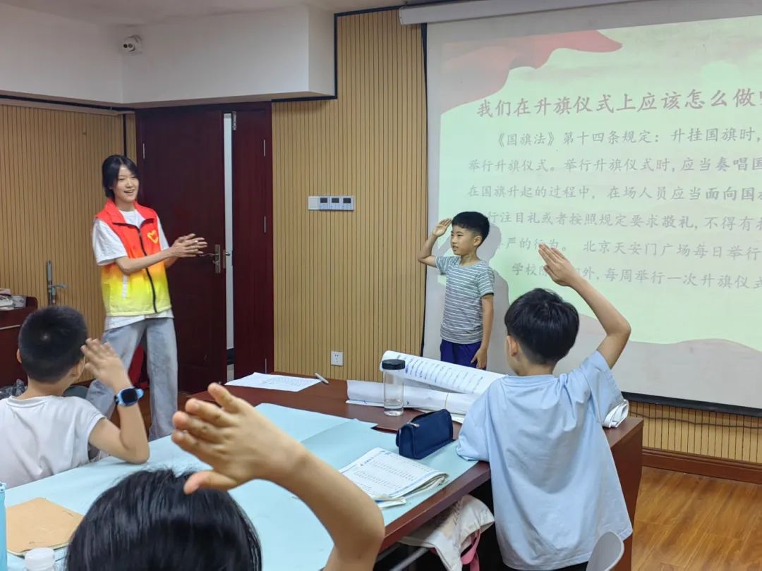“国旗象征着什么?”实践团成员陈雨彤围绕《国旗法》给孩子们开展了一堂生动的普法课,以“致敬国旗升起的时刻”视频为导引,带领大家认识了国旗的含义与由来,跟随着视频中人民军队的步伐,孩子们身临其境地参与了一场天安门升旗仪式。当成员讲到根据《国旗法》规定,在国旗升起的过程中要求敬礼时,在场的少先队员们迫不及待地到台前争做示范。当雄壮的国歌响起,大家一同起身齐唱,眼中满是感动与自豪。一位小朋友还说道:“国旗是国家的象征和标志,我们每个人都有责任和义务去维护它的尊严。”
