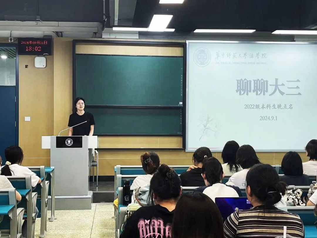 2022级本科生辅导员姜孝文以“安全、收心、规划”为关键词,结合2024届法学本科生毕业去向,分析了当前就业形势与行业需求,与同学们共同探讨了大三这一年的重要性。同学们分享了暑期实习经历,并就大三规划、就业方向和生活等方面的疑惑进行交流讨论。姜孝文希望同学们尽早进入学习状态,思考、规划好大三这关键的一年,脚踏实地,查漏补缺,提升竞争力。