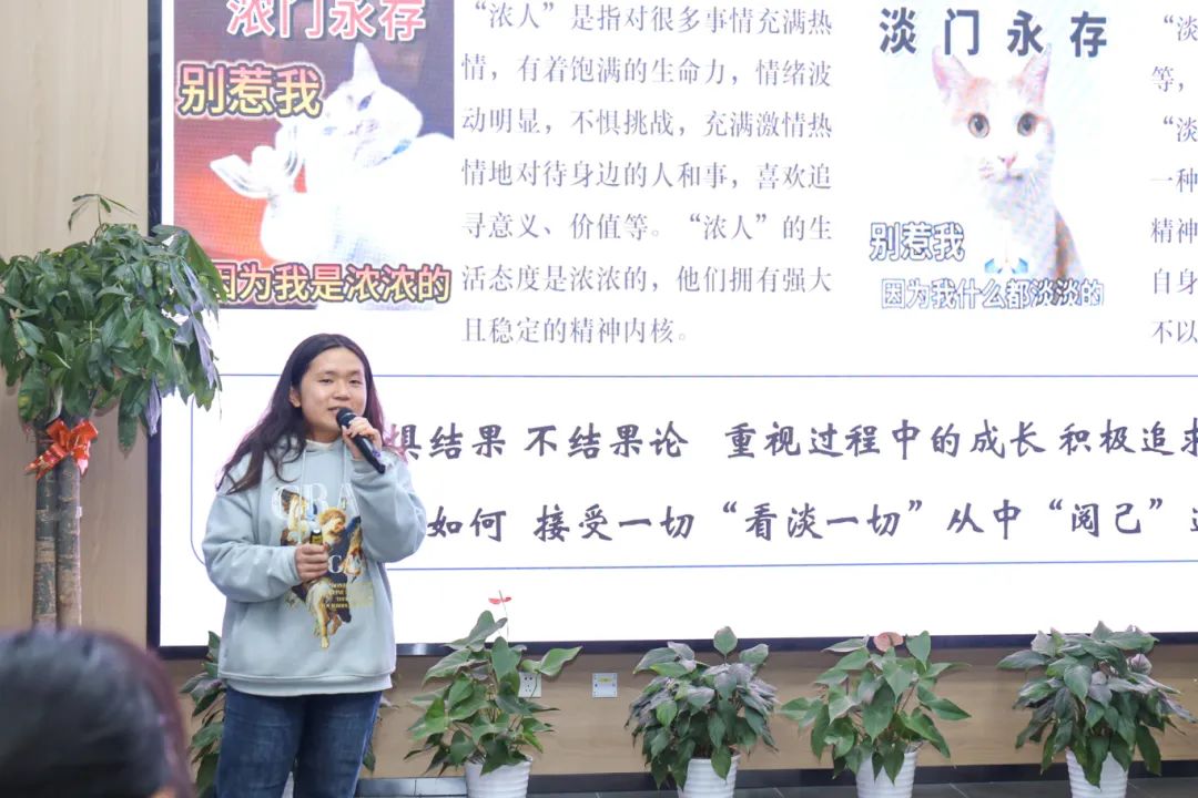 林婧以“浓人”“淡人”为喻,分享学习方法,如要将预习、听讲、复习环环相扣,课前快速浏览课文,课中认真听讲,课后及时复习。在竞赛方面,她鼓励同学们勇敢争取机会,并且要注重过程中的收获而非结果,要以“淡人”心态对待成果。