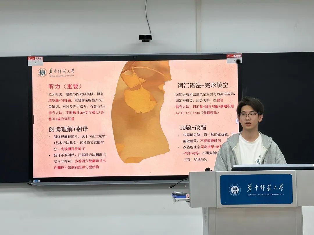 3月26日晚,灋行生涯规划与学习发展中心于法学院102教室举办“学长学姐说之英语学习经验分享会”。活动特邀本科生赵炜楷、祝振豪担任主讲,围绕英语学习方法与应试技巧展开系统指导。两位同学详细解析四六级备考策略,从日常积累、题型攻克、时间管理等维度分享实用经验,并通过典型案例剖析进行现场答疑,传递了英语学习的实用方法。