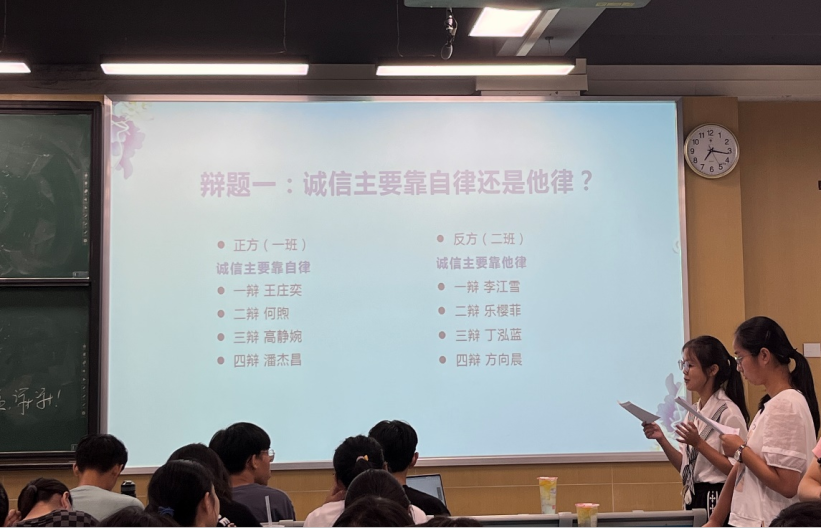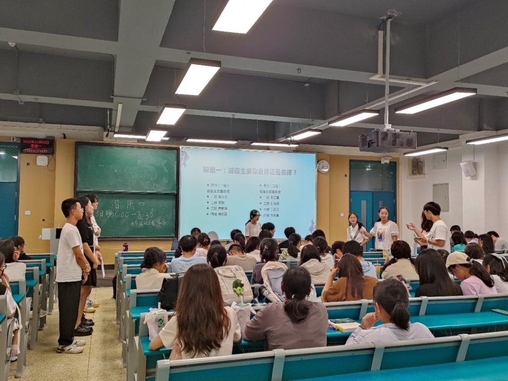 以辩论会友,育诚信精神。校纪校规学习教育后,辩论赛——“诚信主要是靠自律还是他律”正式开始。正反双方围绕诚信的定义、自律与他律的差异、诚信的意义等方面展开辩论,引发了同学们关于诚信问题的进一步思考。本次辩论赛共计24名同学参与。赛后未参赛同学们表示,“支持正方观点,自律的作用是决定性的,任何他律形式都必须内化于心才能起到作用,而这个内化的过程恰恰是自律的作用”,“我认为他律是诚信的保障,这需要通过一定的社会规范、法律体系来规范”,“希望多开展辩论赛这种活动,让更多同学参与进来”……