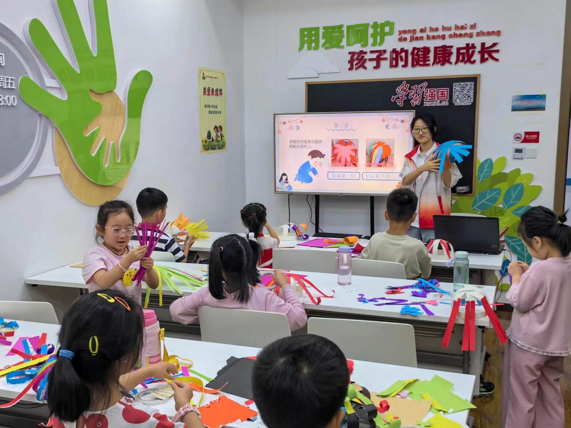在志愿者的演示与指导下,孩子们开始了“假发”制作的探索之旅。他们仔细观察、认真聆听,并发挥各自的想象力与创造力,时而埋头苦干,时而与小伙伴们交流心得。从剪裁彩纸到缝制毛线,再到粘贴装饰品,孩子们手法逐渐娴熟,每个步骤都认真对待。最终,一顶顶独特的手工“假发”逐渐成型,有的是卡通角色的造型,有的融入了现代元素。他们将自己制作的“假发”进行展示、相互分享,与志愿者共同记录这一快乐的时光。