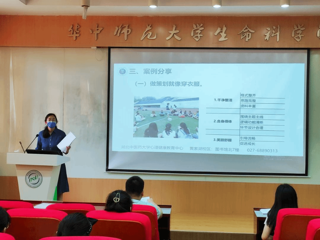 后期培训则在生命科学学院“生科树洞”心理工作站进行。余璇以“手把手教你开展心理健康教育主题班级活动”为主题,通过列举案例,从活动设计、内容安排、活动分工等方面讲授如何设计心理健康教育主题班级活动以及4F法则在班级活动中的应用。同时,以小组互评、学员作品点评的方式开展交流分享。余璇表示,心理健康班级活动的开展形式要丰富,可以通过喜闻乐见的游戏,让同学们在娱乐中领悟到相应的道理。