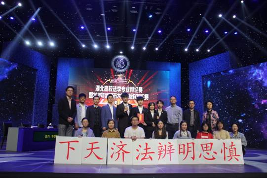 法学院讯(通讯员焦修齐 摄影李欣)4月22日下午,第九届“法理争鸣”湖北高校法学专业辩论赛暨2019年武汉市大学生版权辩论赛决赛暨颁奖典礼于武汉教育电视台演播厅成功举行。我院党委书记杨臣、副处级组织员郭冰、院长助理、法硕中心主任文杰、辩论队指导老师杨涛、辅导员吴凡、胡羽、恽力达及四十余名学生到场观看决赛,参与本届“法辩盟”的颁奖典礼暨闭幕式。