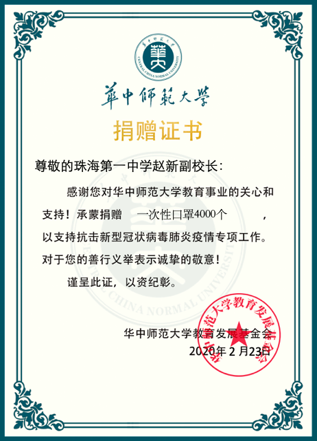 我校原政治系法学专业1988级校友赵新向我校捐赠医用口罩4000个,用拳拳爱心表达对母校的牵挂和支持。此批口罩定向捐给法学院、马克思主义学院和校医院。赵新现任珠海一中副校长,中学高级教师,曾荣获广东省“三八红旗手”、珠海市优秀教师、珠海市教育系统优秀党员等荣誉。