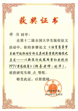 在本届征文活动在学院组织支持和刘华教授的指导下,我院知识产权法方向研究生穆洁的论文《体育赛事节目的可版权性分析及其对类案裁判路径之启发——以新浪诉凤凰网案和央视诉PPTV案为视角》荣获研究生组二等奖,本科生朱思佳的论文《著作权权利滥用的法解释学解构》获本科生组优秀奖;同时,在上一届全国大学生版权征文中一等奖获得者陈怡欣同学的论文《二次创作中转换性使用解释下合理使用制度之调适》、二等奖获得者廖焰迪同学的论文《论我国孤儿作品规定中查找制度的完善》等入选刚刚由人民教育出版社出版的《版权×创新×未来——第十一届全国大学生版权征文优秀论文选》文集并在大会交流。