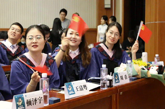 至此,典礼第一阶段全部结束。在转场环节,毕业生杨自奇、李晨翮、万郭怡、黄升虹带来了精彩的毕业歌曲串烧表演,并以此祝福中国共产党建党一百周年生日快乐!祝福祖国繁荣昌盛!祝福学校和学院事业蒸蒸日上!祝福同门毕业快乐!同时,现场播放了学院老师们精心为毕业生录制的祝福视频,简单的寄语却能够直抵人心。