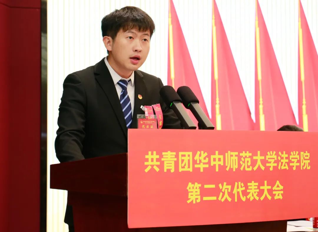 大会主席团成员、秘书长张永基同志代表共青团华中师范大学法学院第一届委员会向大会作题为《深化政治引领 聚焦法学特色 锐意改革创新 团结带领广大法苑青年在建设教师教育领先的世界一流大学和推进学院高质量发展征程中贡献青春力量》的报告。