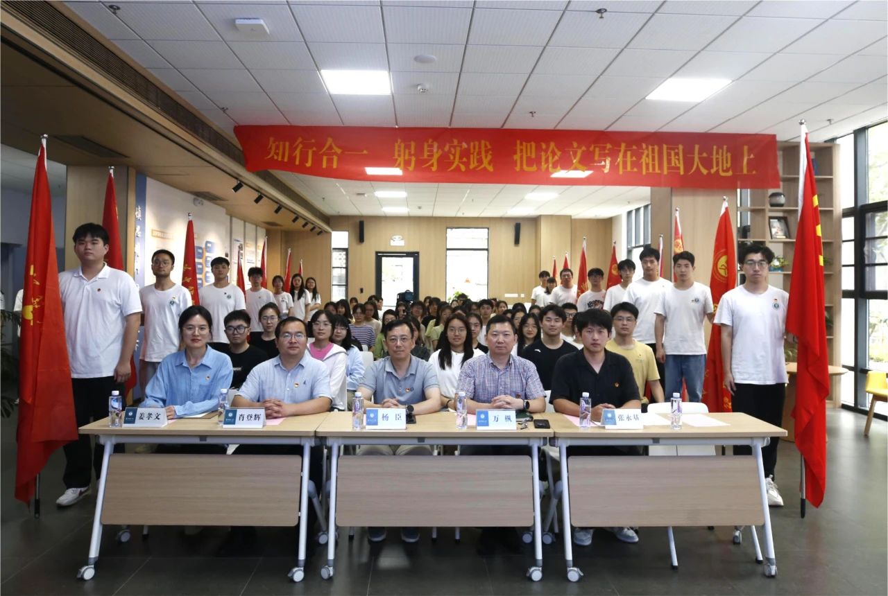 杨臣、万枞、肖登辉分别为实践队授旗。