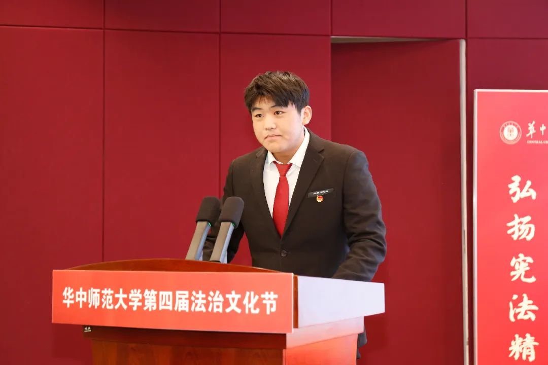 学生代表马克思主义学院朱浩维作为学生代表发言,他在发言中结合自身经历分享参与法治文化节活动的收获和体会,表示要学习好专业知识和法律知识,以做一名优秀的思政教师为目标,为法治宣传教育和法治中国建设贡献华师学子力量。