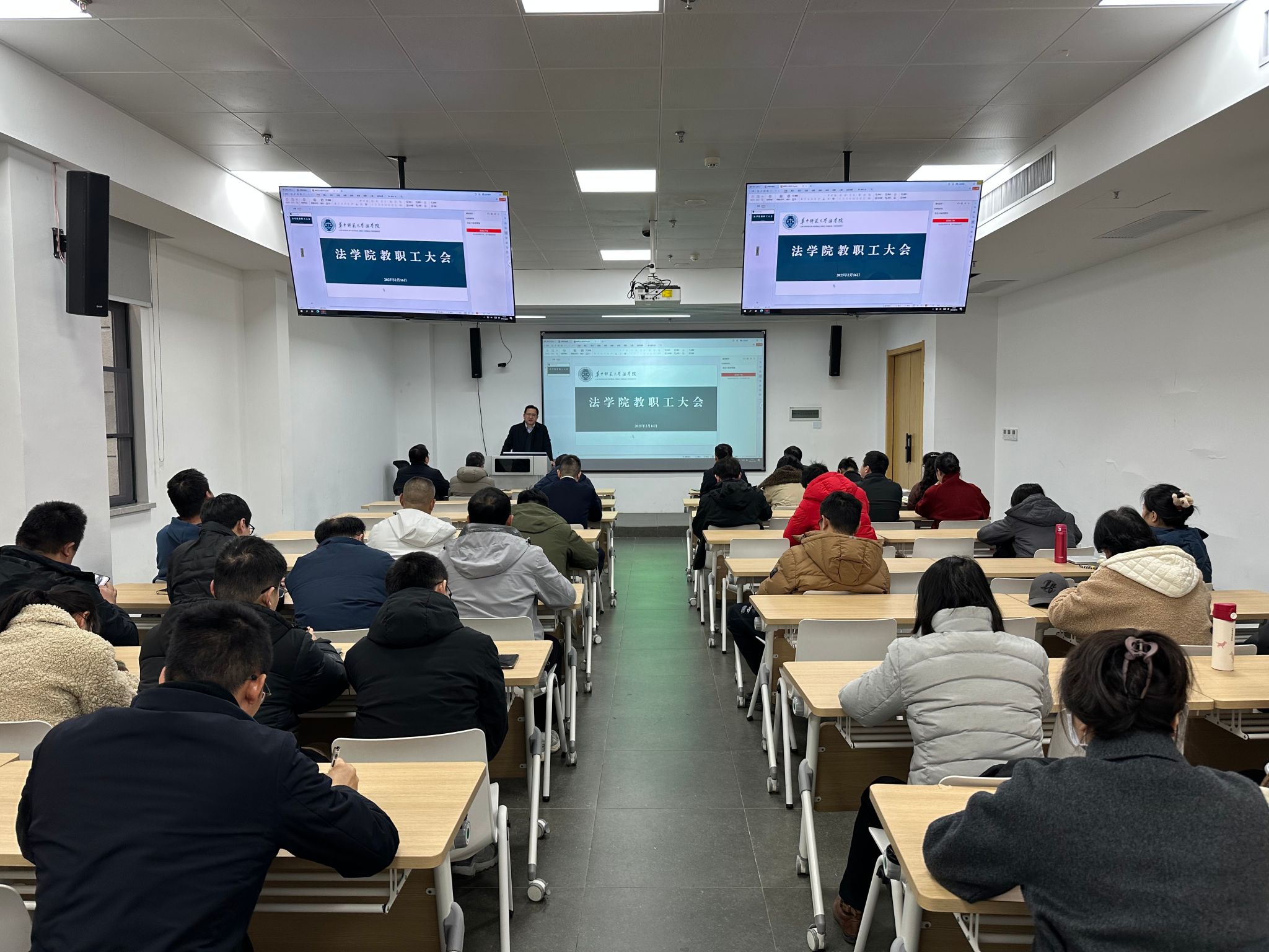 2月16日下午,法学院召开新学期教职工大会,学院全体教职工参加,学院党委书记杨臣主持。