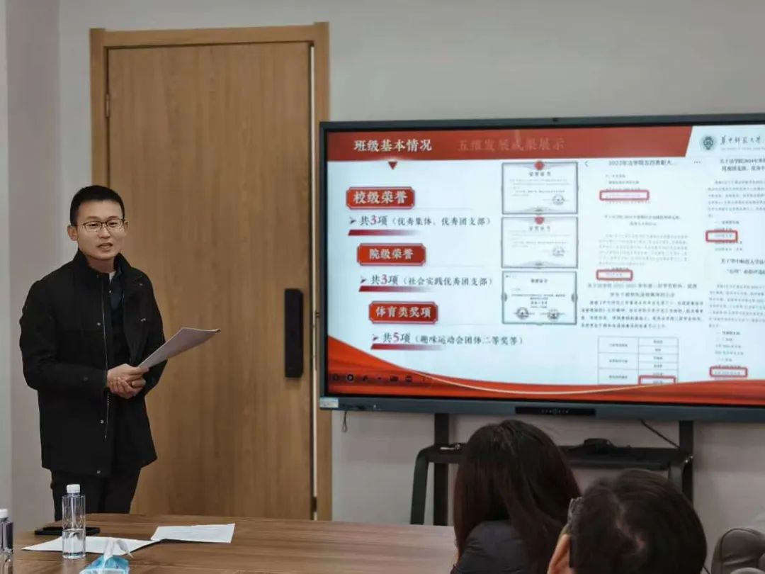 在交流环节,与会班主任和辅导员就各自工作实践中积累的经验和心得展开交流。2203班班主任周林以“五维共进,筑梦未来”为主题,分别从“学、思、行、体、风”五个维度分享班主任工作经验和班级建设成果。