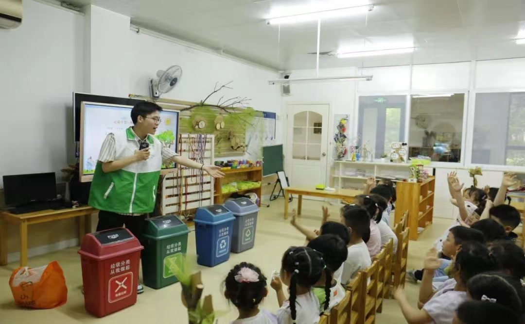进园后,园长向志愿者们介绍了幼儿园的基本情况和教育理念,随后带领志愿者们参观了孩子们的学习区和娱乐区。在了解了幼儿园的基本教学后,社区工作人员与华师志愿者联袂上阵,通过生动有趣的讲解和互动演示,将垃圾分类的重要性与具体操作方法寓教于乐,生动呈现给在场的每一位小朋友,使孩子们对垃圾分类有了基本的了解。